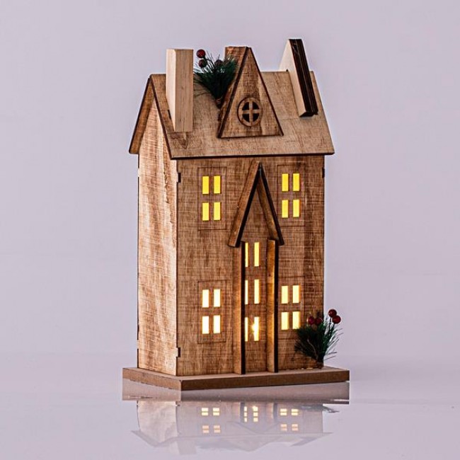 ΞΥΛΙΝΟ ΣΠΙΤΑΚΙ ΦΩΤΙΖΟΜΕΝΟ, 3 LED 5mm, ΜΠΑΤΑΡΙΑΣ, ΘΕΡΜΟ ΛΕΥΚΟ, 17x11x31cm, IP20